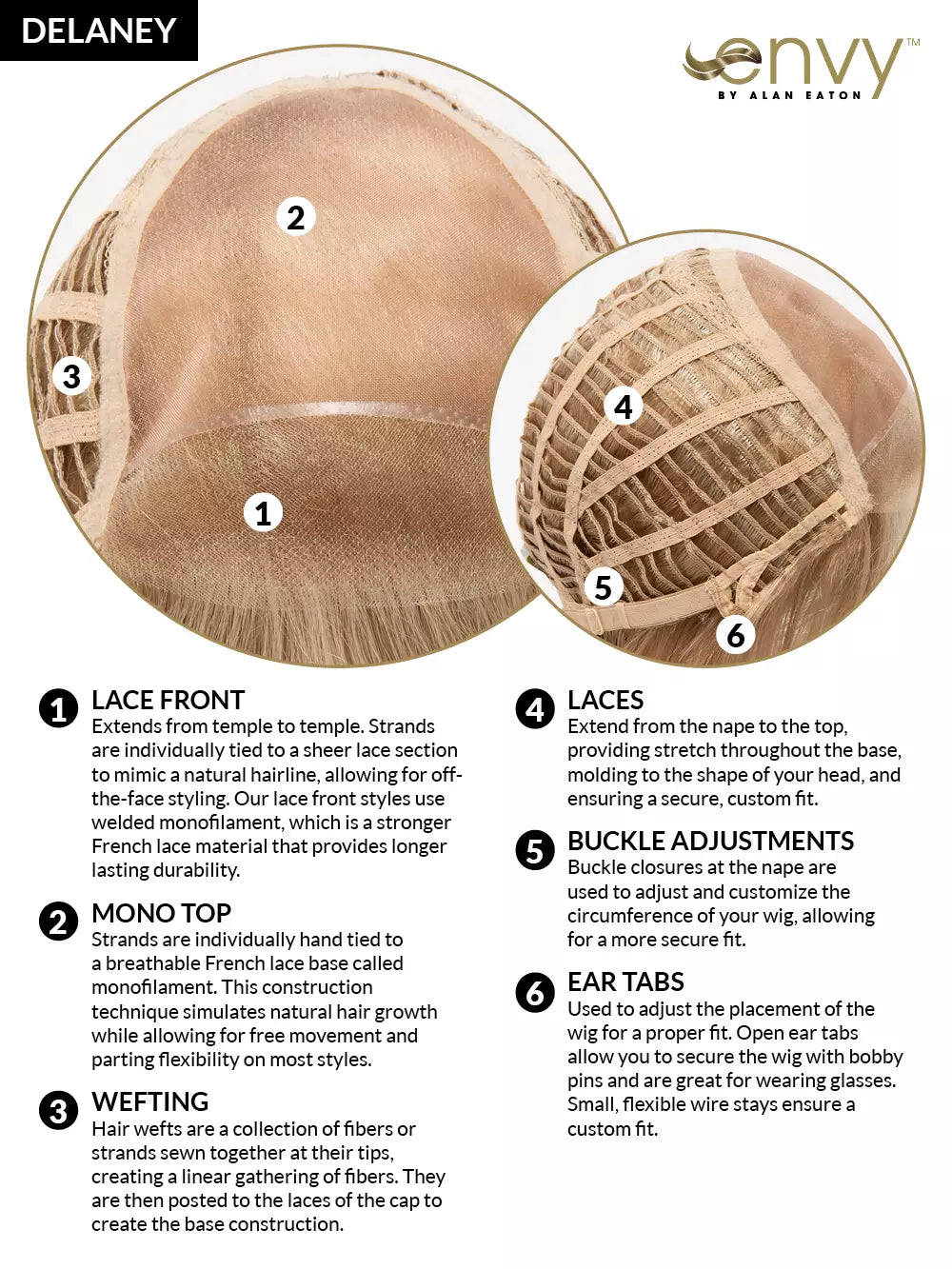 DELANEY by ENVY gives you long piece-y bangs and shaggy layers for a sporty take on the ever-popular bob. Its Lace Front Mono Top construction offers one of the industry’s most natural-looking hairlines. Perfect for sweeping your bangs to the side or entirely back from your face.