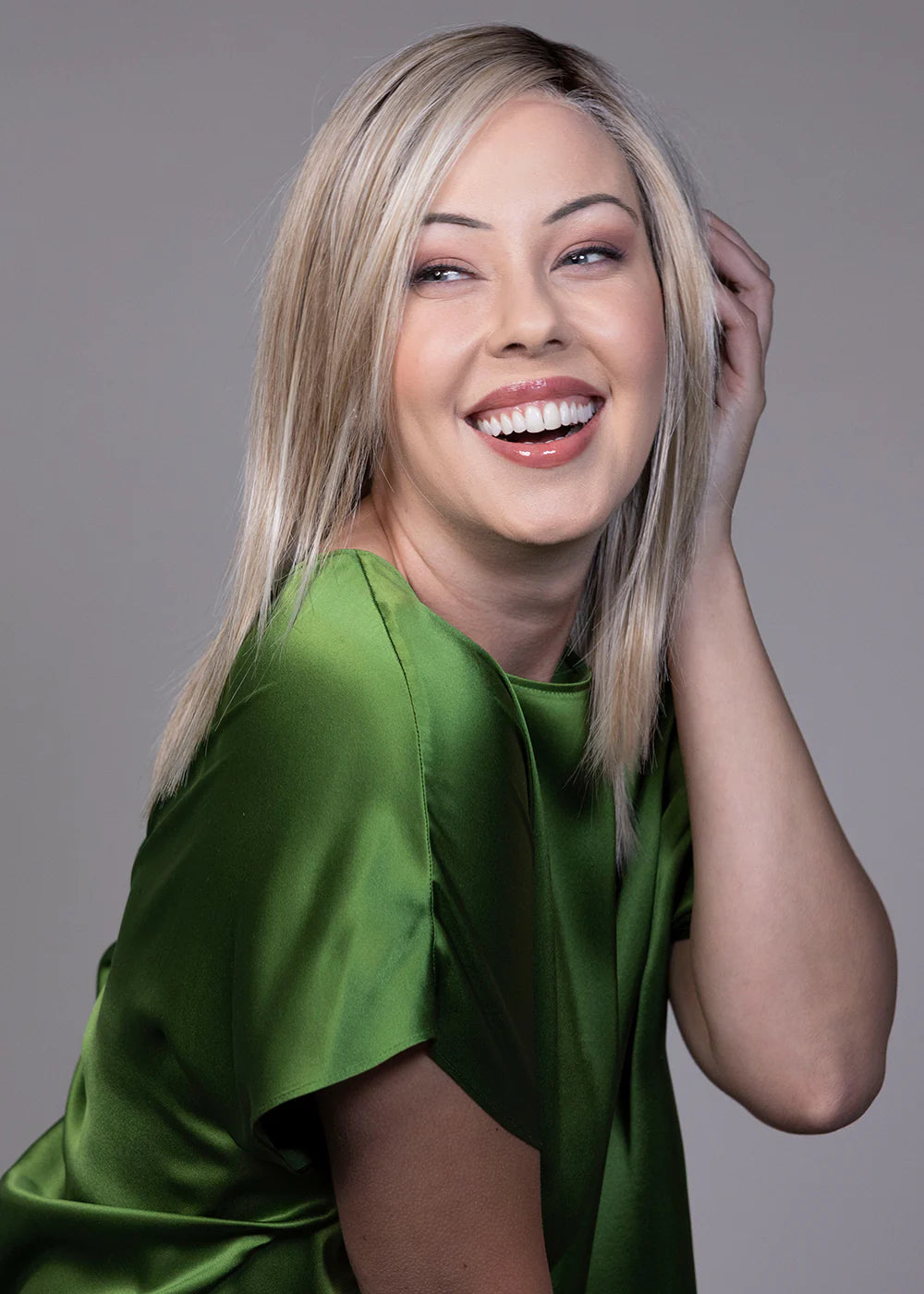 Peppermint is layered to perfection with feathery front layers that help to frame the face and add dimension. This collarbone-grazing cute provides a sleek, sweet look while keeping the full volume on top.