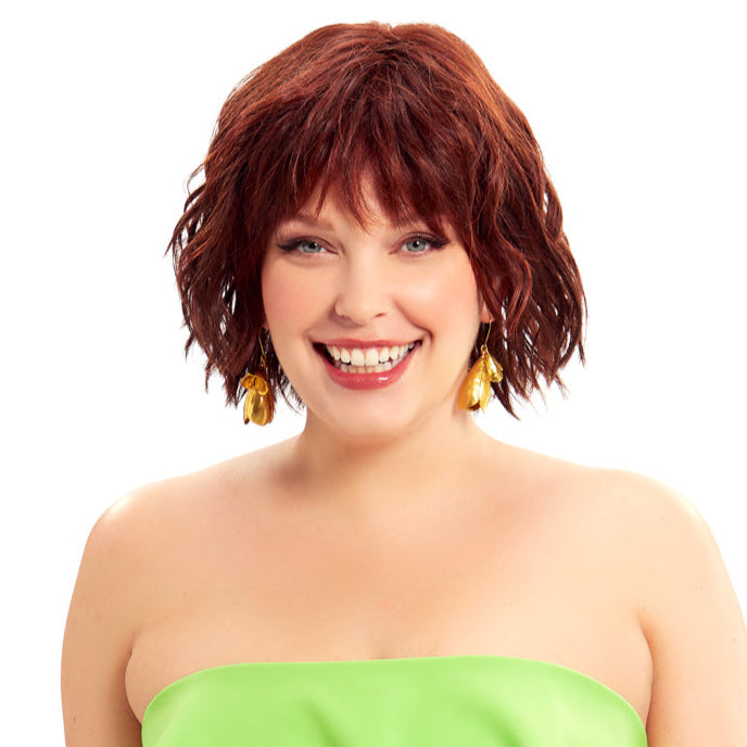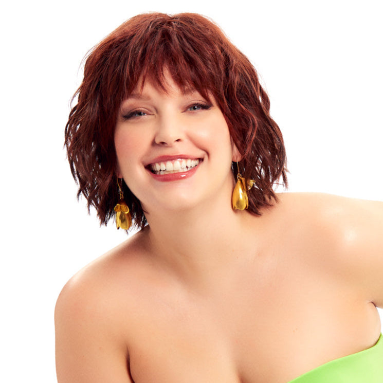 Short textured layers of beach waves, silky feathered bangs, a smooth silky top, and bob back that falls above the collar. Featuring a Sheer Comfort Mono Top and Soft Lace Front that is double hand knotted for weightless comfort. Ear-to-ear feathered bangs brush in any direction or off the face for an undetectable hairline and part.